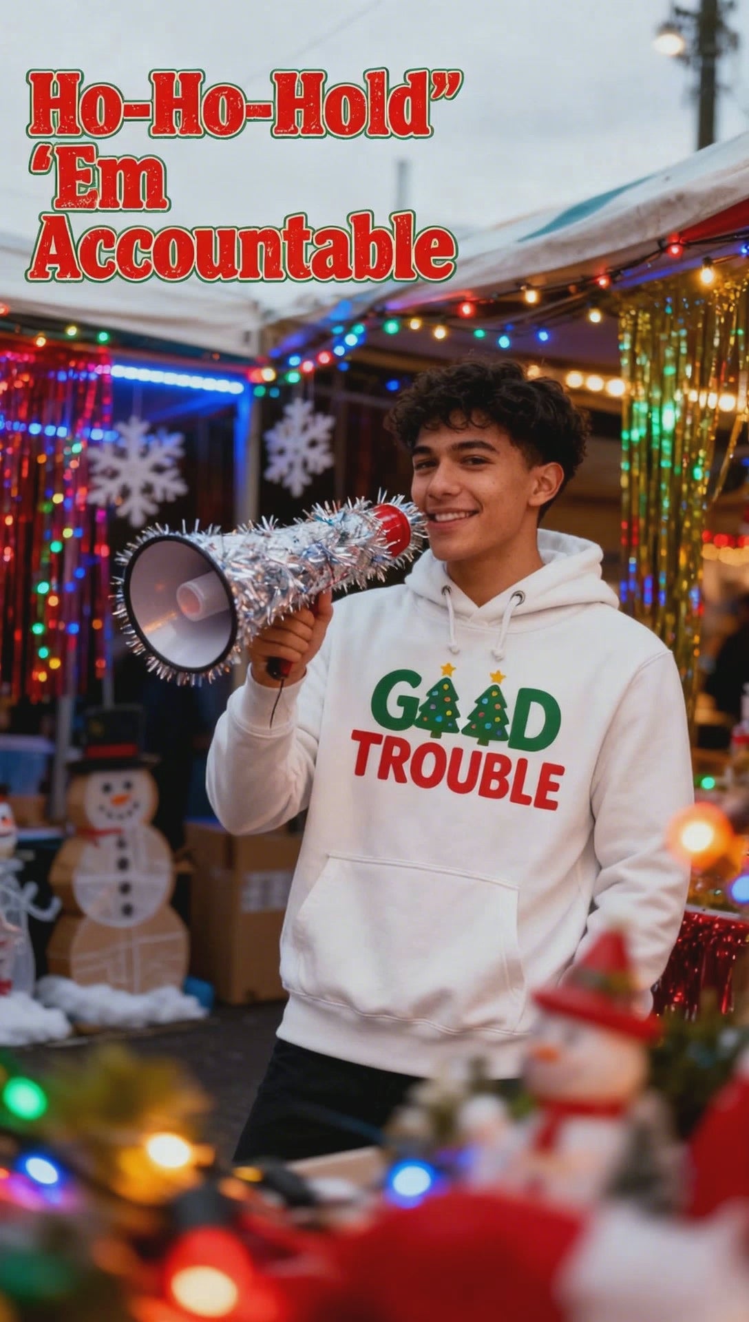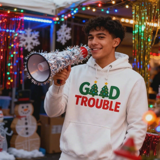 Embrace the season of goodwill and fun with the Good Trouble Christmas Sweatshirt! Whether you're treating yourself or someone special, this sweatshirt is sure to impress. Shop now to add a touch of good trouble to your holiday wardrobe!